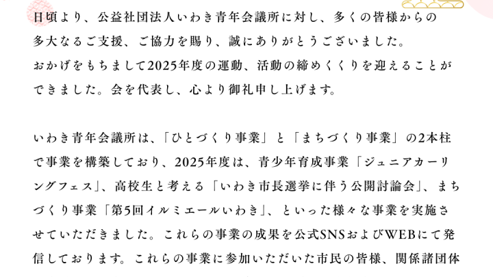 投稿者: iwaki-jc-kanri 2025年12月31日 0 【 11月例会『生産者と考えるいわきの未来』を開催しました】 2025.11.7(金)本年度入会の新入会員による11月例会『生産者と…